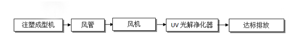 該公司在生產(chǎn)過程中有注塑成型工序,該工序產(chǎn)生了一定量非甲烷總烴有機廢氣。根據(jù)廠房提供的資料,我們工程師在參考了廣東省地方標(biāo)準(zhǔn)《大氣污染物排放標(biāo)準(zhǔn)》(DB44/27-2001),中華人民共和國《大氣污染物綜合排放標(biāo)準(zhǔn)》(GB16297-1996)后,根據(jù)以往工程經(jīng)驗,為該企業(yè)選擇了UV光解為主體處理工藝。